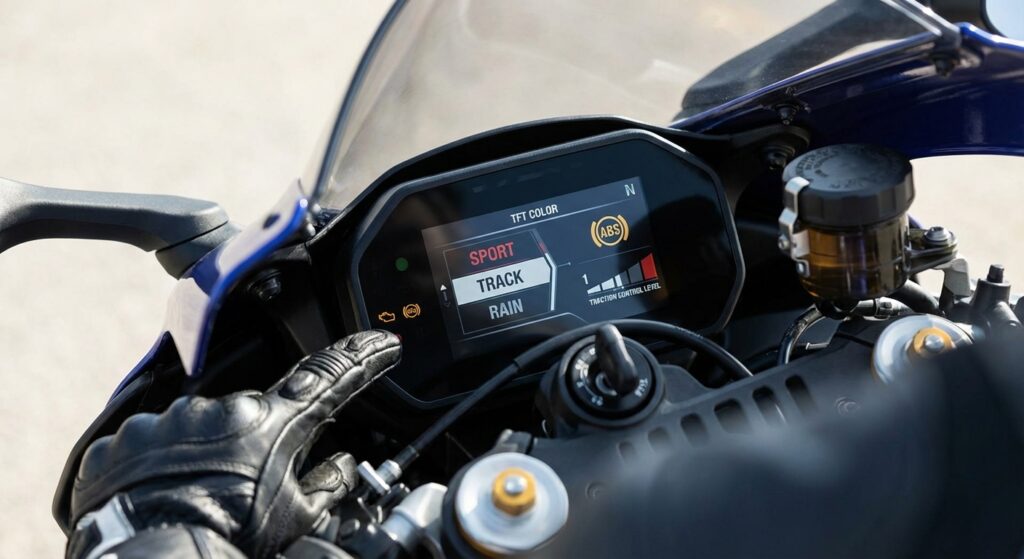 À l’inverse, le mode Track libère l’intégralité de la puissance avec une réponse instantanée à la poignée, réduit l’intervention du TC (autorisant un léger patinage contrôlé en sortie de virage, plus rapide), et active l’ABS cornering pour permettre des freinages tardifs en pleine inclinaison. Ce mode exige une maîtrise technique confirmée et ne devrait être utilisé qu’en environnement fermé (circuit).